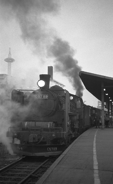 右)京都タワーにも灯がともるころ、1番線にはC57の重連。1970年12月
